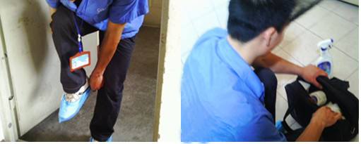 三、得到客户的同意,穿上鞋套,走进客户家中。拿了洗洗工具,准备清洗空调。