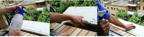七、用清水冲洗冷凝器翅片,再用药水喷洒冷凝器,用抹布将空调外机擦拭干净。